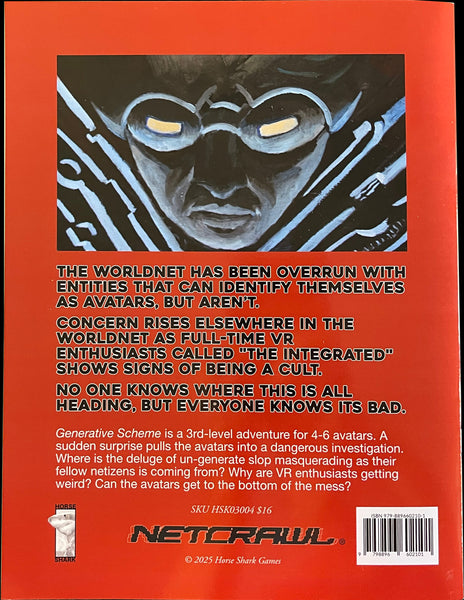 Generative Scheme is a 3rd-level adventure for 4-6 avatars. A sudden surprise pulls the avatars into a dangerous investigation. Where is the deluge of un-generate slop masquerading as their fellow netizens is coming from? Why are VR enthusiasts getting weird? Can the avatars get to the bottom of the mess?